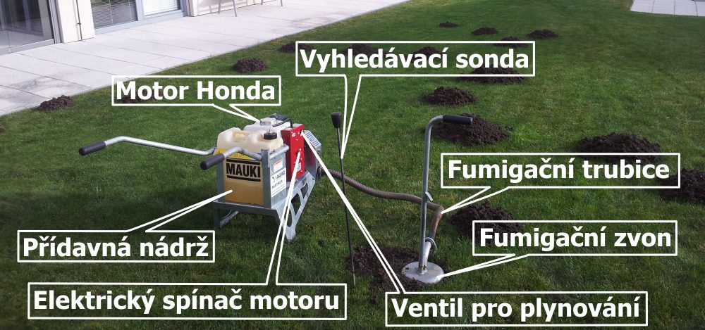 Zařízení je velmi praktické. Umožňuje usmrcení škůdců, kteří žijí v zemi, tím, že se zavedou výfukové plyny (výfukové plyny čtyřdobého motoru plus výfukové plyny z fumigačního systému) do podzemních chodeb škůdců. Pro maximální účinek je třeba naplánovat dostatečnou dobu fumigace. V závislosti na délce dráhy lze očekávat dobu vykuřování cca 5 minut na stavbu (otvor chodby) škůdce. Vykuřovací zařízení se zvonem se umísťuje na volný (otevřený) vstup do systému chodeb škůdce a zatlačením zvonu do půdy zabraňuje úniku plynu do okolí. Tři hroty drží zvon ve stálé poloze. Přidáním 2% motorové nafty se stanou výfukové plyny dobře viditelné. Tím se stává podzemní rozmístění systému chodeb viditelné i na povrchu a to díky únikům kouře v sondou provedených otvorech. Při používání přístroje je třeba věnovat pozornost pokynům uvedeným v návodu k obsluze.